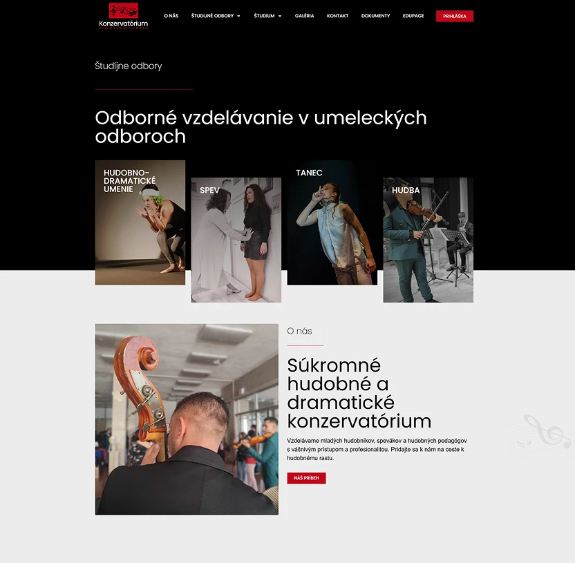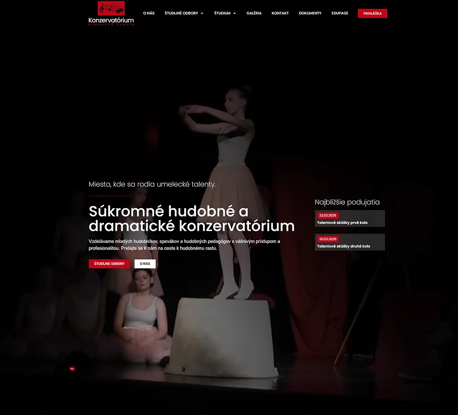 Pri návrhu webovej stránky sme sa zamerali na vytvorenie moderného a vizuálne atraktívneho dizajnu, ktorý reflektuje umelecký charakter konzervatória a jeho jedinečnú atmosféru. Dôležitým aspektom bola prehľadná štruktúra obsahu a intuitívna navigácia, aby sa študenti, uchádzači aj verejnosť vedeli rýchlo zorientovať v ponuke študijných odborov, aktivitách a podujatiach školy.
